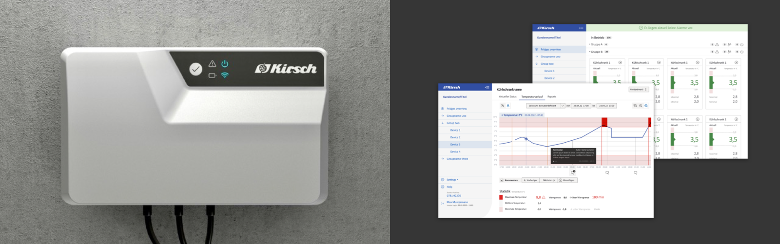 Beim UX/UI Design der Cloud haben wir ein UX Review, ein UX-Konzept für ausgewählte Seiten sowie die Stilfindung und das UI-Design für Kirsch übernommen. Unser Hauptaugenmerk lag auf der Darstellung der Informationen auf dem Dashboard. Diese sind für die Nutzer von entscheidender Bedeutung, da sie zur Sicherheit bei der Echtzeitüberwachung beitragen. Es ist wichtig, dass alle Abweichungen vom Sollzustand unmittelbar erkannt werden. Die Navigation wurde so gestaltet, dass sie unterschiedliche Nutzertypen unterstützt, darunter Beobachter und Experten/Einrichter.