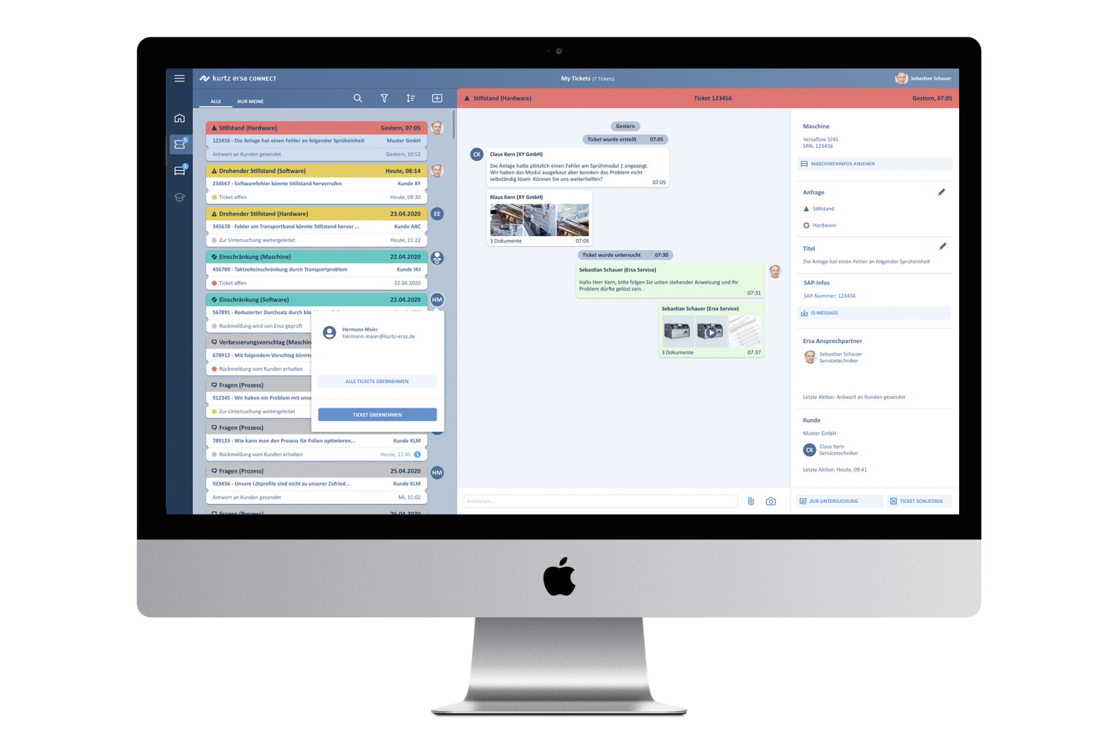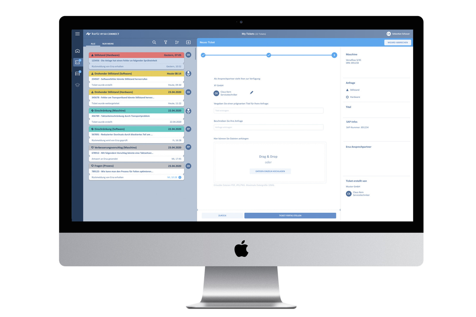 Das Ticketsystem für Service- und SupportAnfragen ermöglicht eine Realtime Diagnose und unterstützt eine eigenständige, zeitnahe Fehlerbehebung. Für die Konzeption und Gestaltung dieser Funktionalität haben wir etablierter Muster aus der privaten Kommunikation herangezogen. Via Chat-Ansicht wird der Dialog zwischen Kunden und Ersa übersichtlich und intuitiv. Zudem haben wir auf die Übersichtlichkeit der Visualisierung und Verschlagwortung der Tickets besonderen Wert gelegt. Dadurch wird eine schnelle Priorisierung der Anfragen möglich. Sowohl der Kunde als auch der Servicemitarbeiter müssen auf den ersten Blick erkennen, welches Ticket sie zuerst übernehmen sollen und was als nächstes zu tun ist. Bedienlogiken, die man aus dem Privatleben gelernt hat, wenn man z. B. Bordkarten in einer App verwaltet oder mit Notifications umgeht, kommen auch hier zum Einsatz.