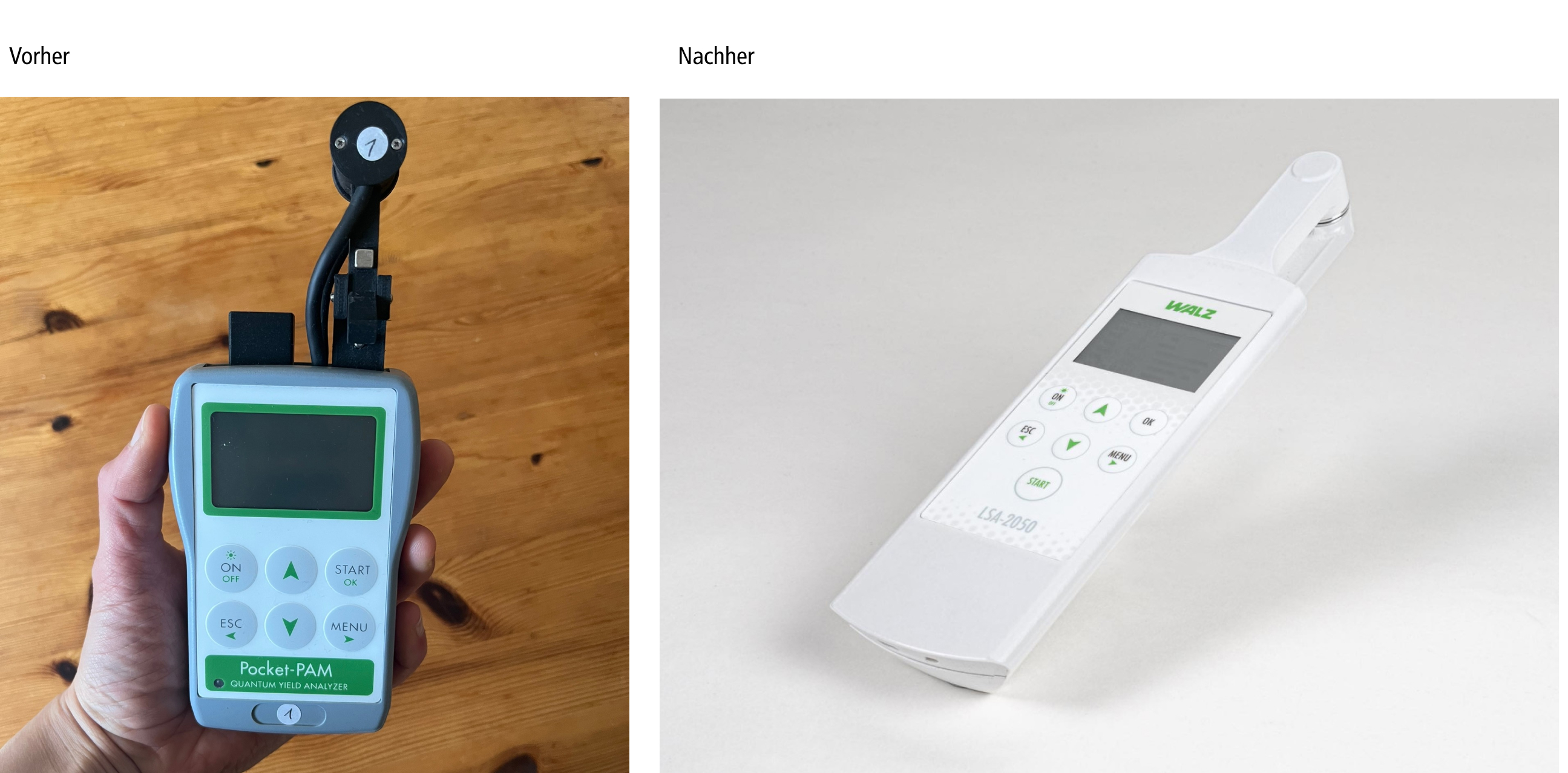 Der LEAF-STATE-ANALYZER LSA-2050 ist ein handgehaltenes Messgerät zur Untersuchung von Pflanzenblättern, das ohne Eingriff in die Pflanze arbeitet. Es prüft, wie gut die Blätter vor UV- und sichtbarem Licht geschützt sind, misst die Menge an grünem Chlorophyll und bewertet die Gesundheit der Pflanze anhand der Effizienz von Photosynthese-Prozessen. Das Gerät zeigt, wie gut eine Pflanze mit Stress umgehen kann und erfasst dabei auch Standortdaten sowie die Ausrichtung der Blätter zur Sonne. Wir haben für Walz ein Industrial Design entwickelt, das ergonomisch und leicht in der Hand liegt und im 3D-Druck Verfahren sowie im Spritzgussverfahren hergestellt werden kann.