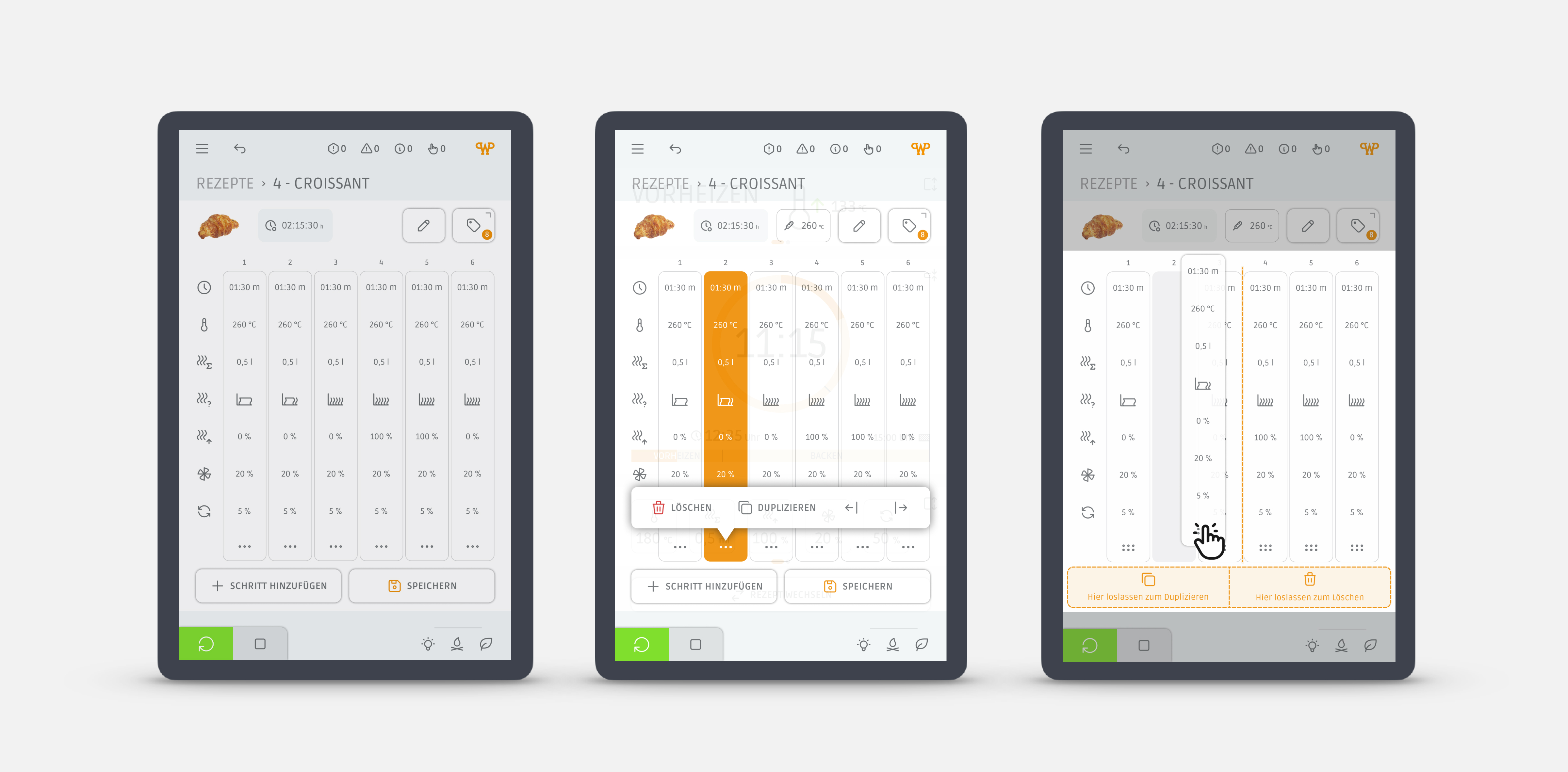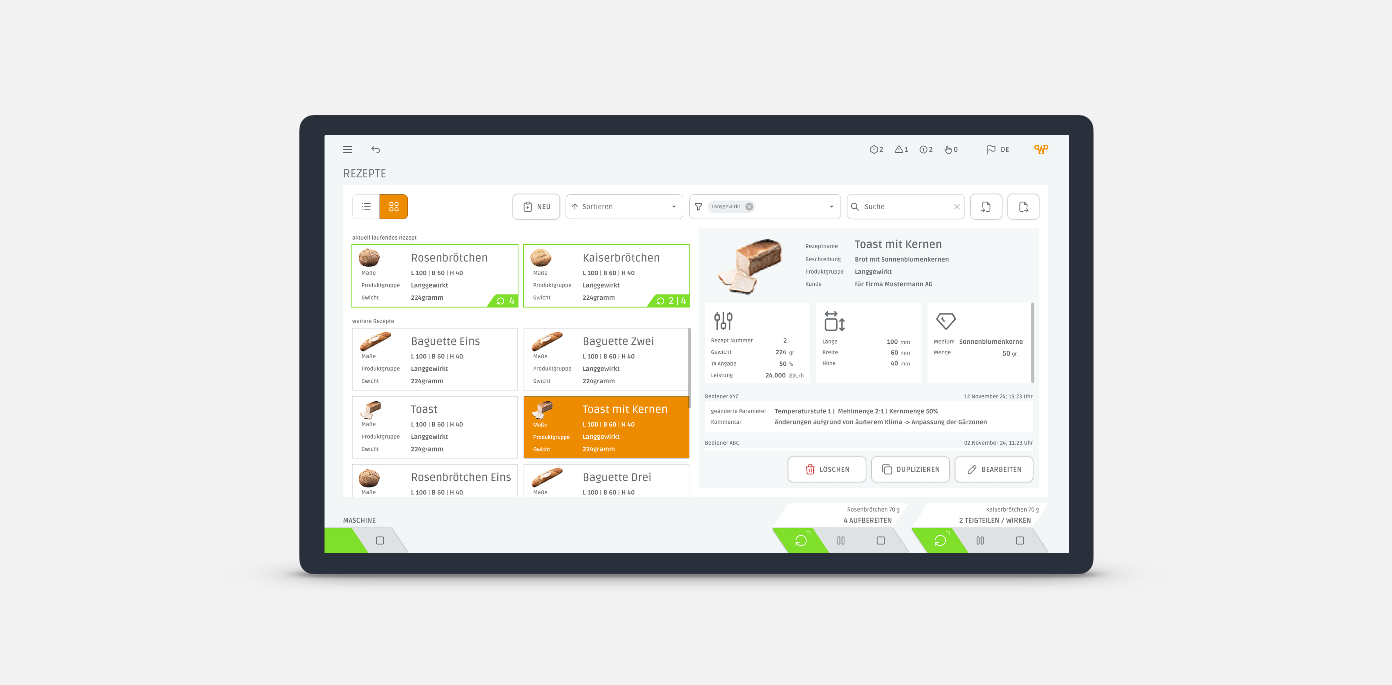 Das neue HMI basiert auf einem klar strukturierten, responsiven UX/UI-Konzept auf Web-Technologie-Basis. Es skaliert von Full-HD-Landscape-Displays großer Anlagen bis zu Portrait-Displays kleinerer Backöfen wie dem Rototherm – mit durchgängiger Bedienlogik über alle Maschinen hinweg.